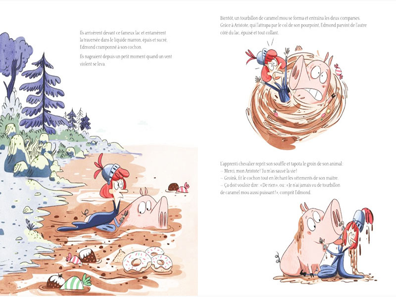 Dans un univers sucré et gourmand, Edmond, sur les ordres de son père, doit partir délivrer la princesse du royaume voisin, l’Empire du sucre maléfique. Edmond obtempère sans mal à son père Fulbert et obtient de partir avec Aristote, son fidèle compagnon, un cochon bien rond et bien rose. Ce sera bien lui le héros de l’histoire, lui qui parviendra à sauver Edmond des pires embûches et surtout, lui qui saura deviner les sentiments qui l’animent. Une histoire qui se termine bien donc, grâce à des personnages qui savent accepter l’autre dans ses différences. Les dialogues entre Edmond et son cochon sont savoureux. L’auteur est Richard, comédien, conteur et directeur de la Compagnie Troll. Jess Pauwels est l’illustratrice.