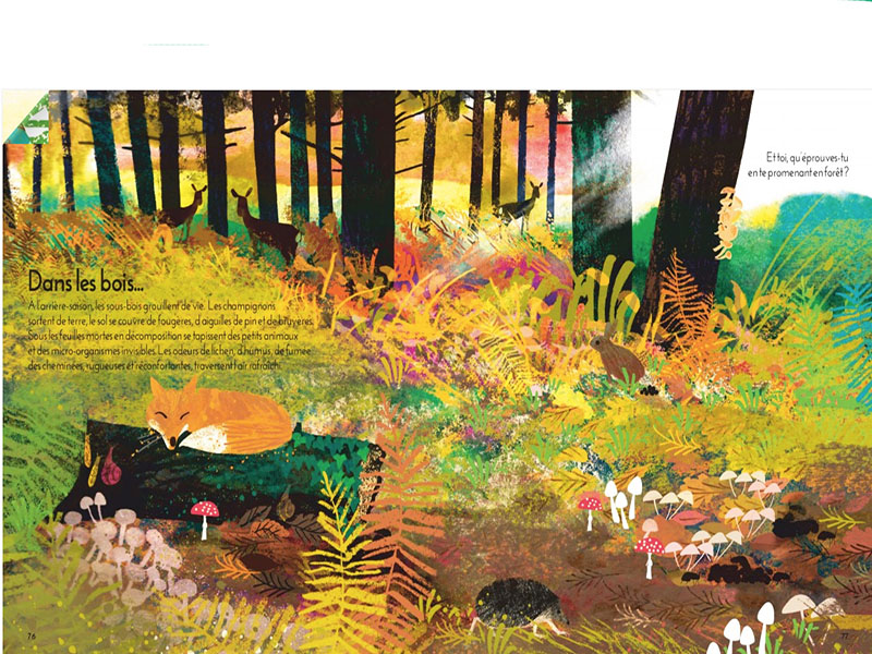 Quatre saisons et quatre chapitres. Les textes sont courts et parsèment les pages, comme pour picorer et lire tout doucement en se laissant « attraper » par les dessins et les couleurs. La lecture fait appel aux sens : « As-tu déjà senti le parfum de la pluie ? » « Goûté la saveur d’un fruit cueilli en été ? » « Remarqué les différentes formes des nuages ou les couleurs changeantes d’un paysage ? ».