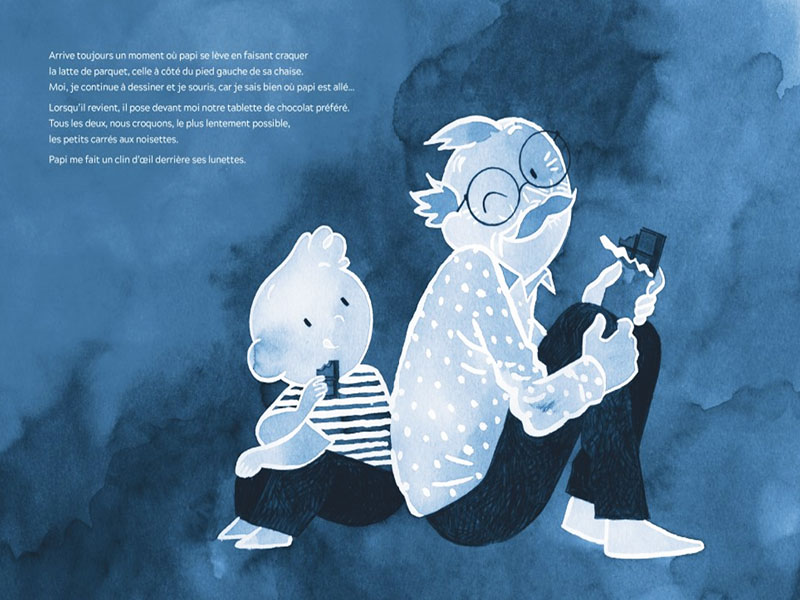 L’histoire de Céline Person raconte la complicité d’un enfant avec son papi, le temps qu’il passe ensemble, leurs petites habitudes, leurs souvenirs. Tout d’un coup, l’enfant s’interroge : « Il y a plein de lignes sur ton visage ». « Ce ne sont pas des lignes, répond le grand-père mystérieusement. Ce sont des chemins (…) ». Le livre bascule alors dans les souvenirs du grand-père qui honore ainsi chaque grand moment de sa vie, souligne les étapes qui lui ont permis de se construire et apporte de la tendresse face au temps qui passe. On ne sait d’ailleurs s’il s’agit d’un livre jeunesse ou d’un livre à offrir aux grands-parents ! Le livre mélange ainsi souvenirs présents et souvenirs passés, les place en écho les ns par rapport aux autres. Une belle façon de dire sue l’intensité des moments vécus restent gravés à jamais.