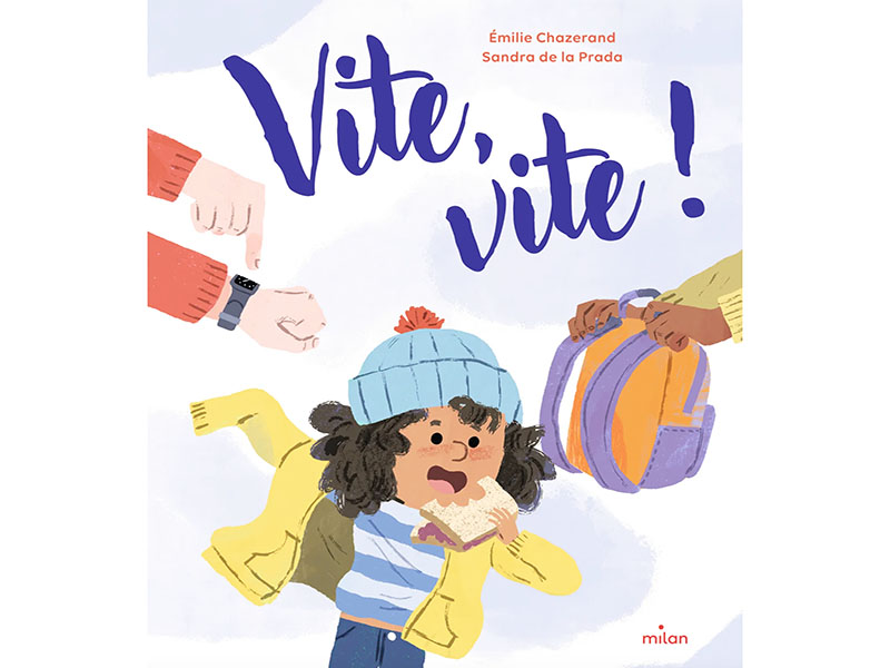 « Vite, vite ! » : voilà ce qu’elle entend de ses parents. « Dépêche-toi de t’habiller, « Dépêche-toi, on va être en retard ! », « Dépêche-toi de manger »…. Les adultes sont toujours pressés d’aller quelque part. L’auteure Émilie Chazerand porte un regard tendre mais sans concession sur ces parents toujours pressés, l’œil sur l’horloge, qui transmettent leur impatience à leur petite fille. Les illustrations de Sandra de la Prada prennent aussi le parti de l’humour en croquant une famille totalement débordée ! Heureusement, tout d’un coup, le temps se suspend. Les parents réalisent que le temps a filé sans qu’ils s’en soient aperçus, et que leur petite fille a beaucoup grandi. Et si le moment était venu de prendre un peu son temps ?
